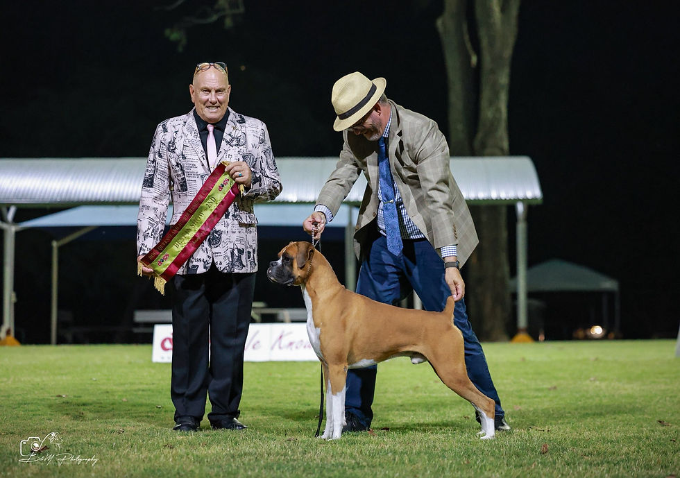 It has proven a bit difficult to get a puppy out of Cleo (not due to her but outside factors). This one was definitely worth the wait! Although it's bitter sweet, as I've grown attached to this brat, he will be leaving to Australia soon to start his show career there. We hope he is as successful as his father, Pohaku has been. It's also an honor that a Boxer breeder judge had found him worthy enough to dedicate his efforts to get this boy to Australia. Judge Brett Thompson had awarded Ricky's mother, Cleo a nice Specialty win back in 2021. We look forward to this boy's exciting future!
